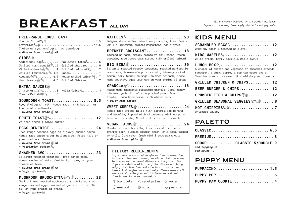 This menu is suitable for casual dining, quick meals, or coffee breaks, providing options for children, dog owners, and those seeking both light and more substantial dishes. The balanced selection of beverages and food items supports a range of preferences and dietary needs.